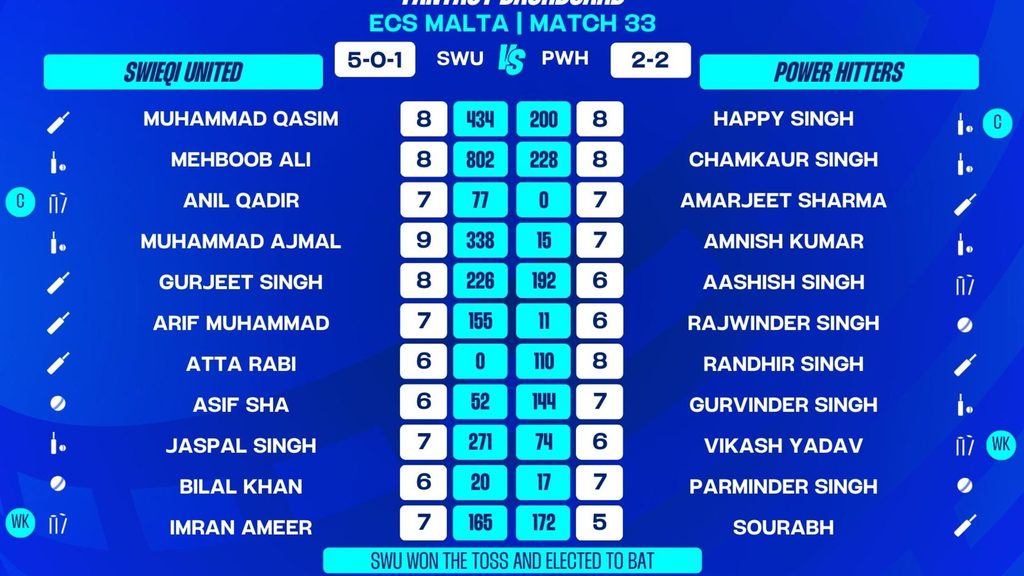 MATCH 33 (ECS25.033) SWIEQI UNITED vs POWER HITTERS 08:15 GMT | 09:15 CET | 13:45 IST