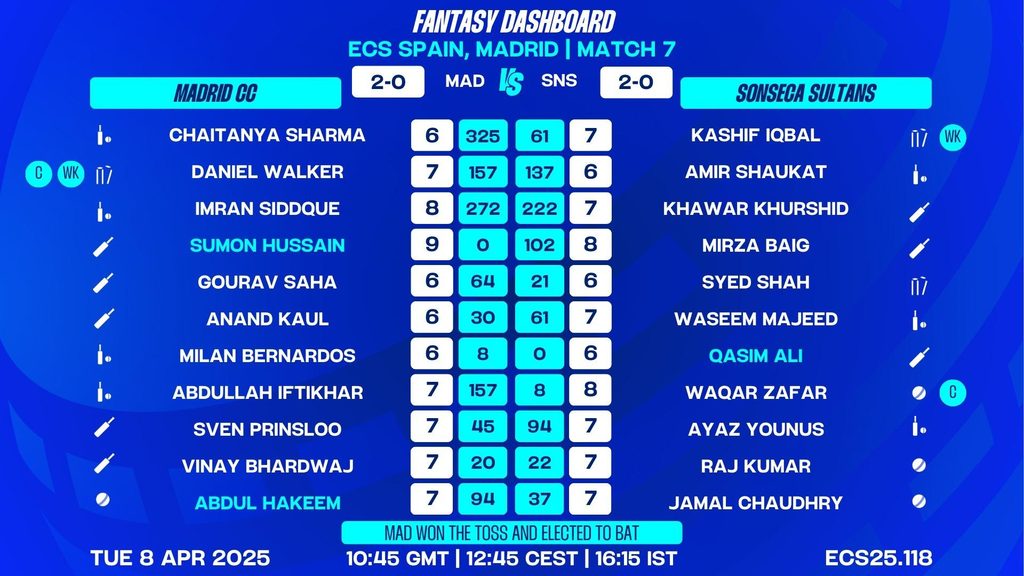MATCH 7 (ECS25.118) Madrid CC vs Sonseca Sultans 11:45 GMT | 12:45 CEST | 16:15 IST