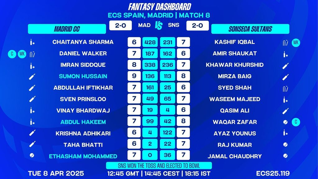 MATCH 8 (ECS25.119) Madrid CC vs Sonseca Sultans 13:45 GMT | 14:45 CEST | 18:15 IST