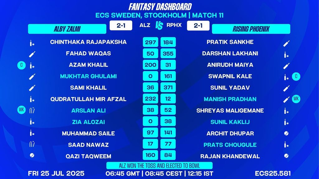 The ECS Sweden, Stockholm, 2025 continues to deliver high-octane T10 action as Alby Zalmi (ALZ) take on Rising Phoenix (RPHX) in Match 11 of the group stage. With both teams boasting a blend of experience and emerging talent, this encounter at the Botkyrka Cricket Center promises fireworks and pivotal moments that could shape the group standings.