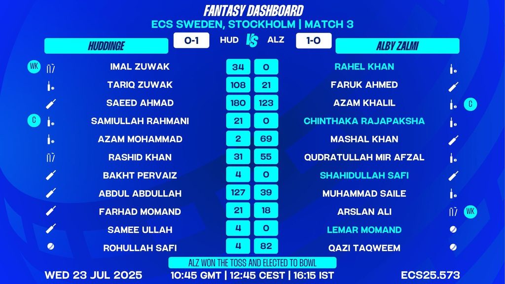 With both Huddinge and Alby Zalmi fielding strong, multi-dimensional squads, Match 3 of ECS Sweden, Stockholm, 2025 is set for a thrilling contest. The battle between the big hitters and the strike bowlers, coupled with the tactical acumen of the captains, will make for compelling viewing. Fantasy managers and fans alike should keep a close eye on the all-rounders and the in-form stars as the action unfolds at Botkyrka Cricket Center.