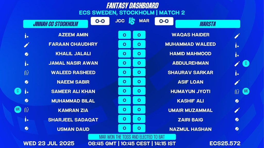 With Marsta winning the toss and opting to bat, expect an aggressive start. Both teams have the firepower to post big scores and take quick wickets, making this a must-watch contest in the ECS Sweden, Stockholm, 2025.