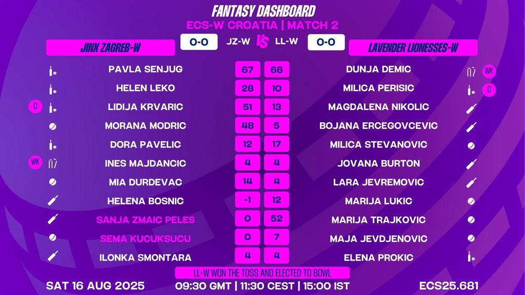 With Jinx Zagreb-W’s experience and all-round strength up against the emerging talents of Lavender Lionesses-W, Match 2 of ECS-W Croatia, 2025 promises to be a fascinating contest. Expect a close battle, with fantasy points and on-field performances likely to go hand-in-hand in this T10 showdown at Mladost Cricket Ground.