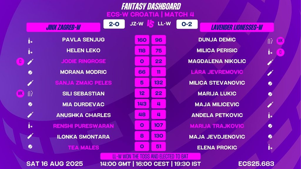 With Jinx Zagreb-W boasting a perfect win record and Lavender Lionesses-W eager to make a statement after winning the toss and opting to bat, this encounter promises to be a fascinating contest of all-round skills and tactical acumen. Expect fireworks at Mladost Cricket Ground as both teams vie for early supremacy in ECS-W Croatia, 2025.