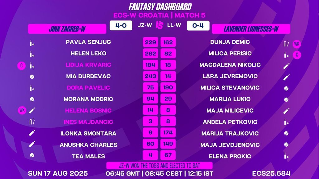 The ECS-W Croatia, 2025 continues to deliver high-octane T10 action as we approach Match 5 of the Single Group stage, featuring a compelling clash between Jinx Zagreb-W (JZ-W) and Lavender Lionesses-W (LL-W). The match is scheduled for 17 August 2025, with the first ball set to be bowled at 08:45 local time in Zagreb (11:15 IST). The picturesque Mladost Cricket Ground will play host to this Group Match, promising a morning of fast-paced cricket.