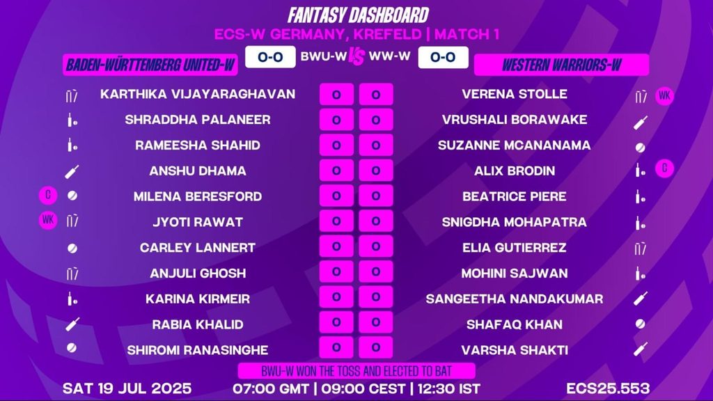 The opening match of ECS-W Germany, Krefeld, 2025 promises an exciting contest between Baden-Wurttemberg United-W and Western Warriors-W. With BWU-W electing to bat first, all eyes will be on their star all-rounders and bowlers to set the tone. For WW-W, the challenge will be to counter BWU-W’s experience with disciplined bowling and enterprising batting. Expect a fast-paced, high-energy encounter as both teams look to start their campaign with a win.
