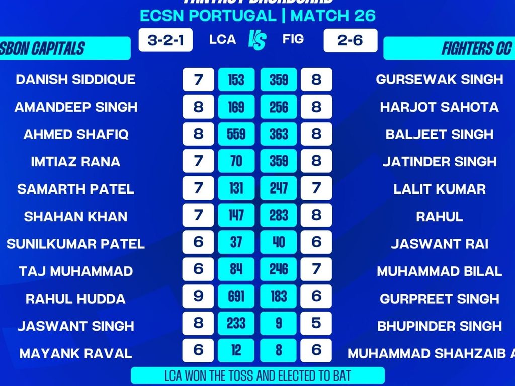 MATCH 26 (ECSN25.026) LISBON CAPITALS vs FIGHTERS CC 20:00 GMT | 21:00 CET | 01:30 IST
