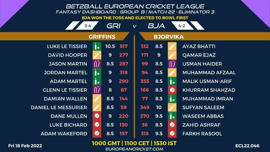 ELIMINATOR 3 - MATCH 22 (ECL22.046) GRIFFINS (GRI) v BJORVIKA (BJA) 1000 GMT | 1100 CET | 1530 IST