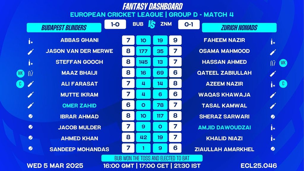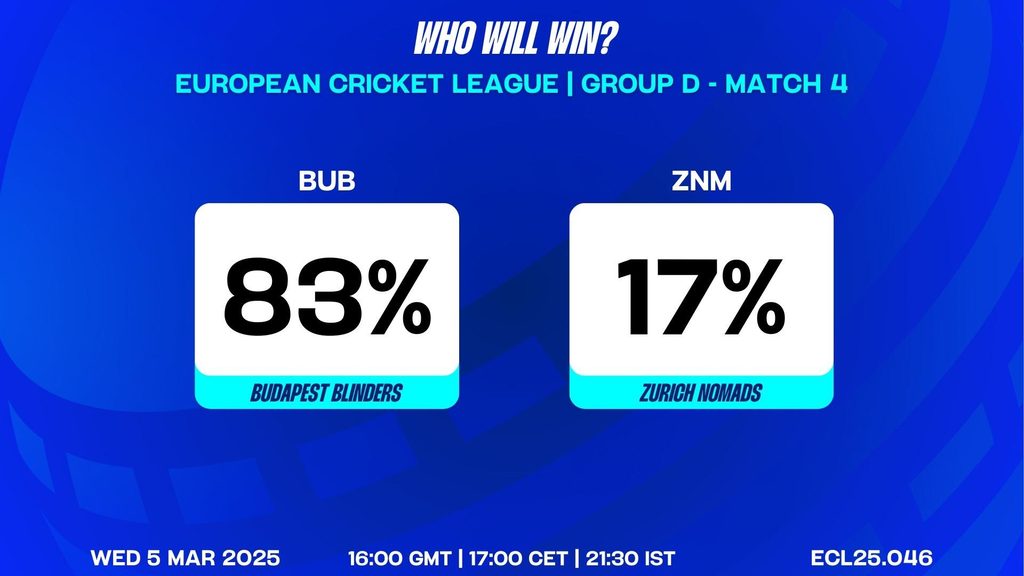 MATCH 4 (ECL25.046) BUDAPEST BLINDERS vs ZURICH NOMADS 16:00 GMT | 17:00 CET | 21:30 IST