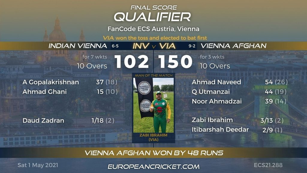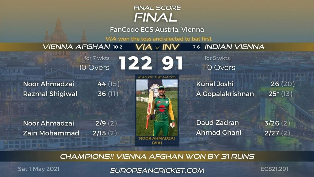 Vienna Afghan vanquished Indian Vienna for the second time in the day to clinch the FanCode ECS Austria Vienna title. A team stacked full of exciting talent, Vienna Afghan also won the ECN Austrian T10 last summer and have now added another major trophy to their cabinet. Noor Ahmadzai was named Man of the Match for his all-round performance.