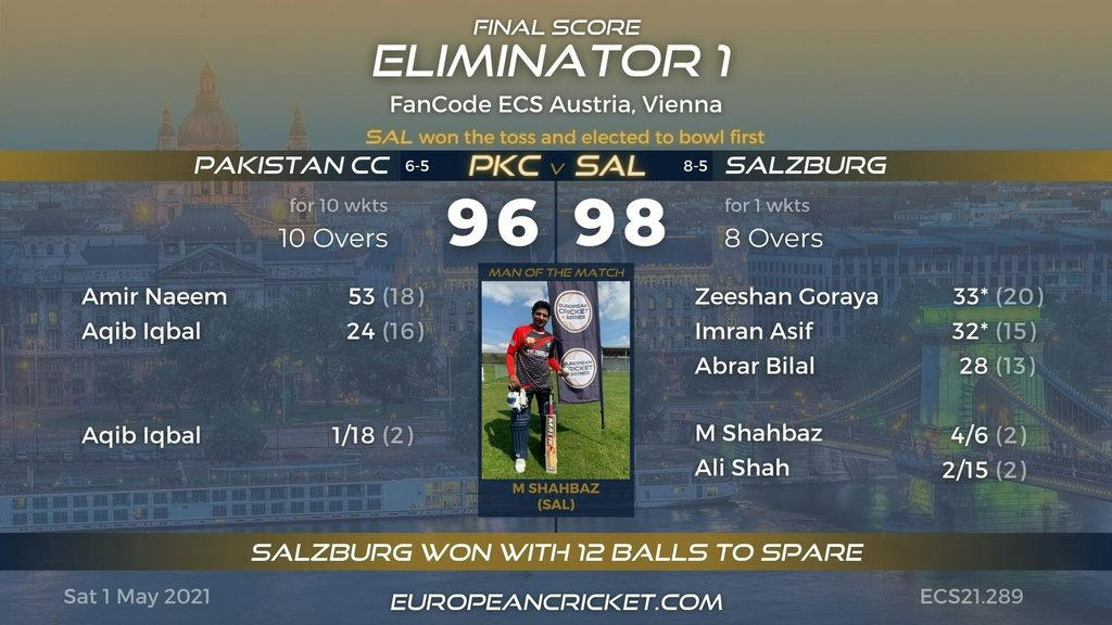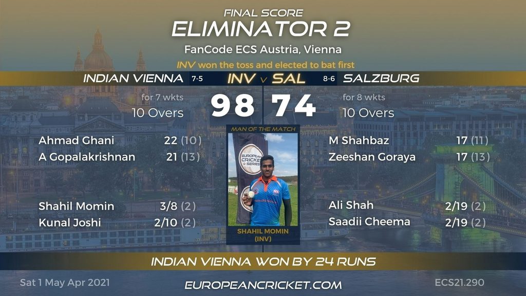 After losing the qualifier earlier in the day, Indian Vienna bounced back with a win against Salzburg in Eliminator 2. Salzburg had a tough task playing four consecutive knockout matches and after beating Pakistan CC in the Eliminator 1, eventually bowed out to Indian Vienna.