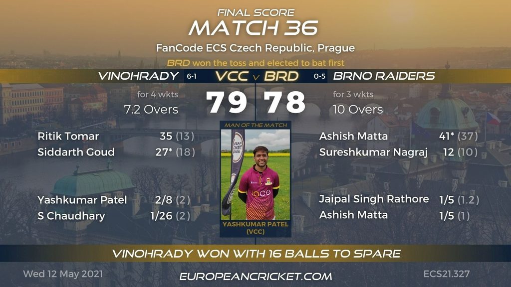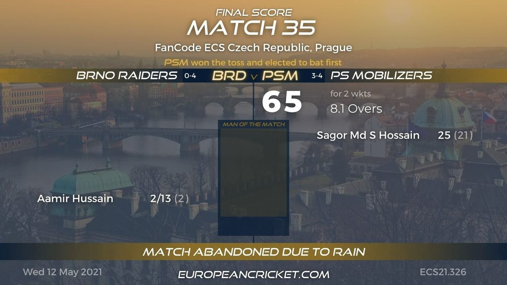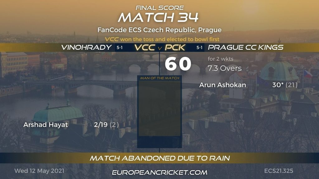 Unfortunately, the next two games were abandoned due to heavy rain. In Match 34, Vinohrady looked in control against leaders Prague CC Kings before rain halted their progress. A No Result in Match 35 gave Brno Raiders their first point in the competition.