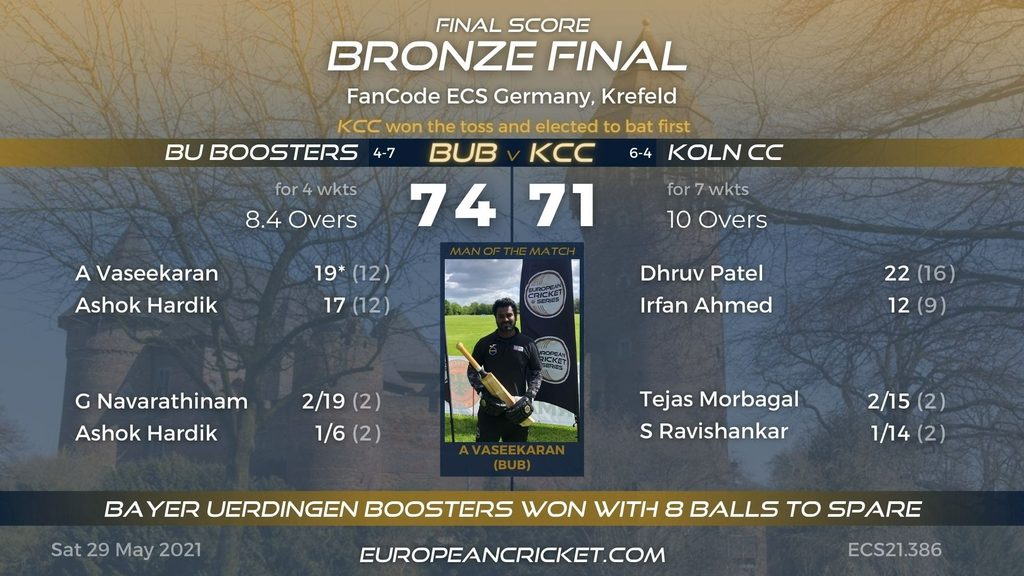Co-hosts Bayer Uerdingen Boosters claimed bronze medal honours beating Koln CC comfortably in the third place play-off.
