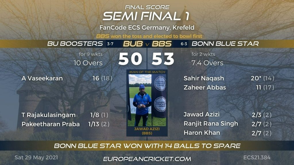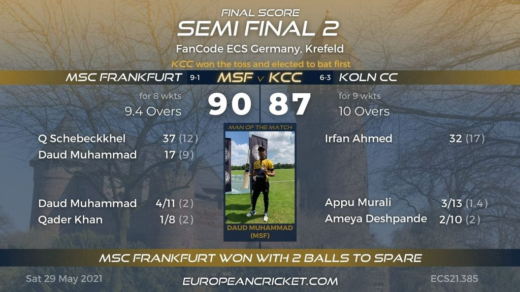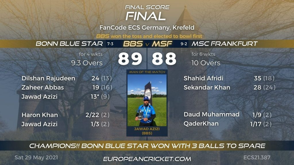 Bonn Blue Star halted MSC Frankfurt's march to secure a second ECS trophy by winning an action-packed Final. Electing to chase after winning the toss, as they have done all throughout this tournament, Bonn Blue Star bowled tight lines not allowing the MSC Frankfurt batsmen to score freely. Although the ECS Frankfurt winners finished their innings with a flurry of boundaries, it didn't prove to be enough as the BBS openers provided a good start with the bat. MSC Frankfurt did fight back, picking up a few wickets, but Bonn Blue Star side had enough firepower to get over the line with three balls to spare.