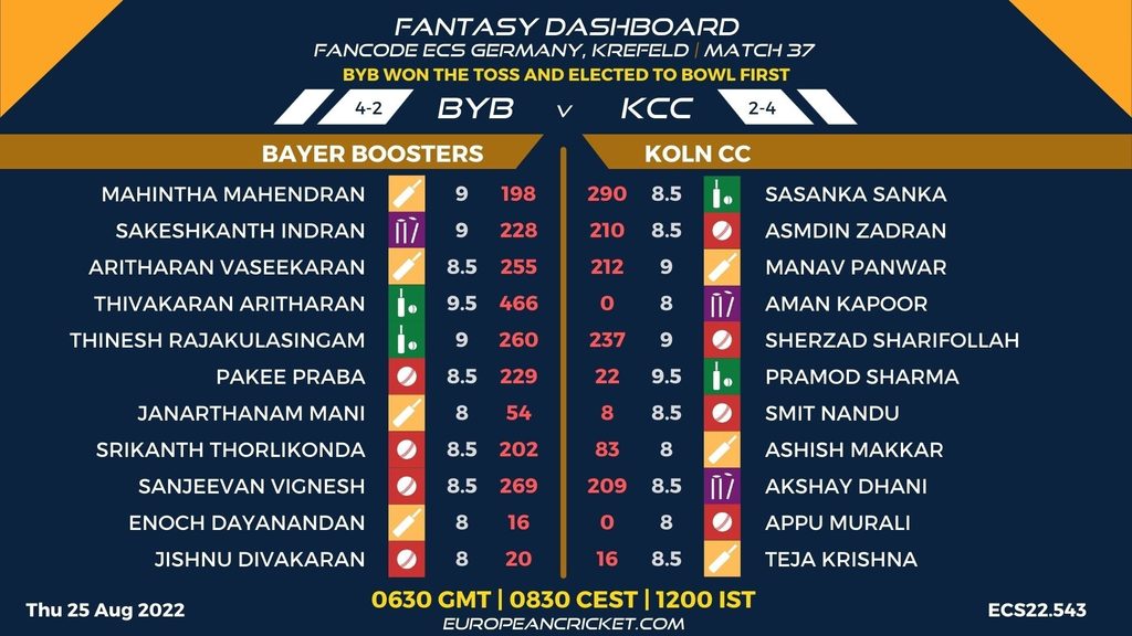 MATCH 37 (ECS22.543) BAYER BOOSTERS (BYB) v KOLN CC (KCC) 0630 GMT | 0830 CEST | 1200 IST
