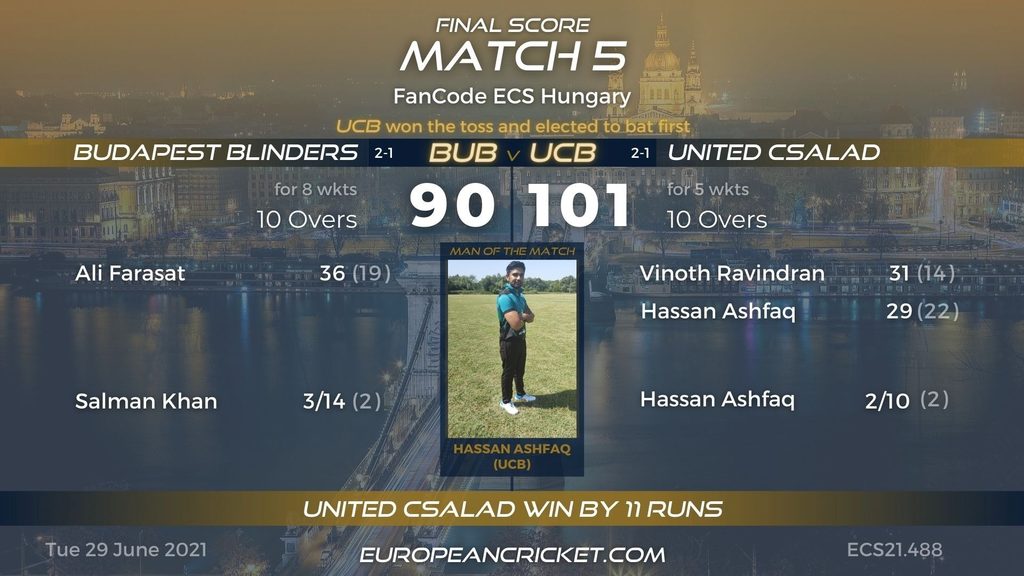 United Csalad got the better of Budapest Blinders in the opening fixture of the day. Vinoth Ravindran and Hassan Ashfaq’s knocks helped UCB register a score of above 100. UCB followed that up with a solid bowling display that helped win the match by 11 runs.