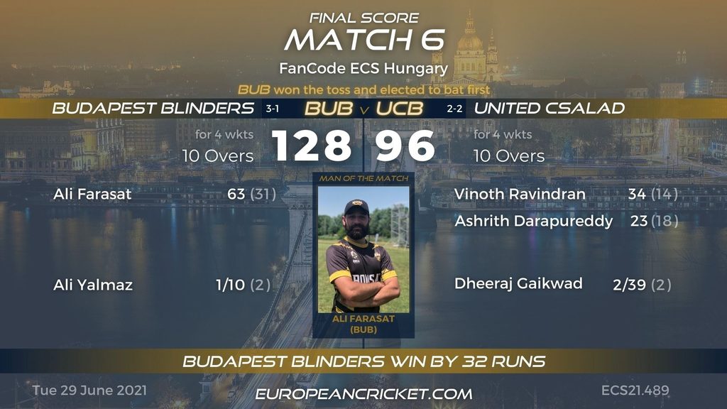 Budapest Blinders got their revenge in the very next match. Ali Farasat led the way with his 31-ball 63 that allowed BUB to score 128. The likes of Ali Yalmaz then restricted the opposition to a score of 96, helping BUB win by a margin of 32 runs.