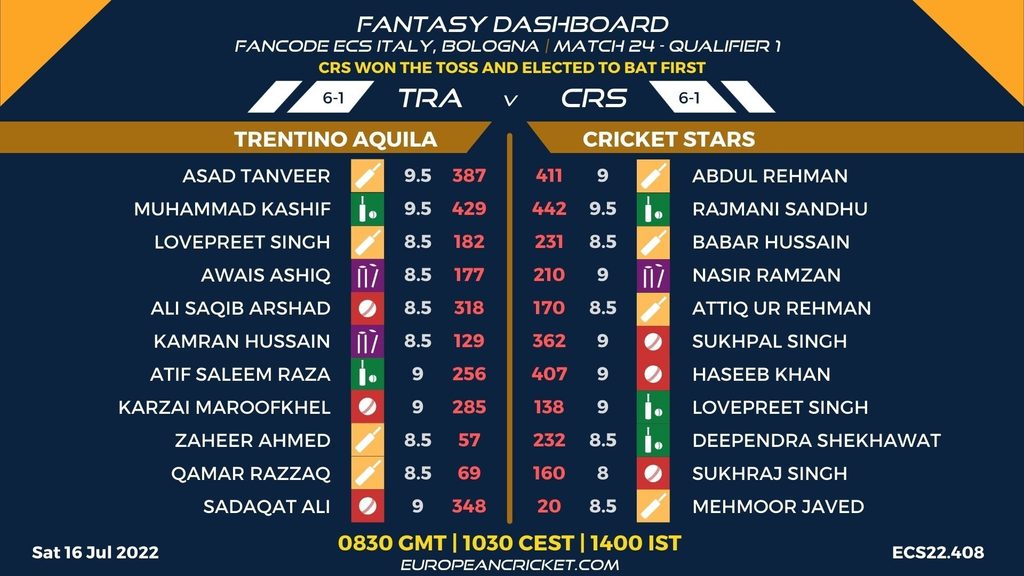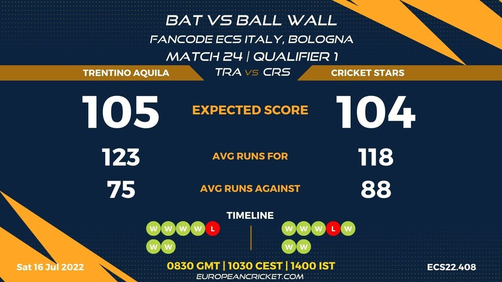 QUALIFIER 1 - MATCH 24 (ECS22.408) TRENTINO AQUILA (TRA) v CRICKET STARS (CRS) 0830 GMT | 1030 CEST | 1400 IST