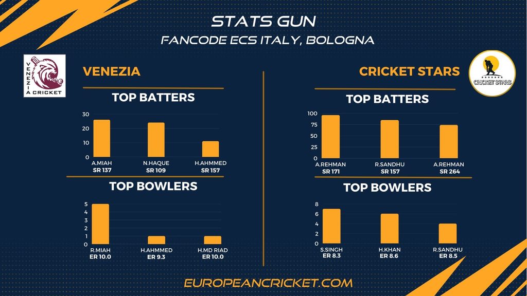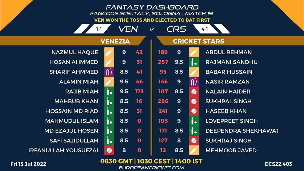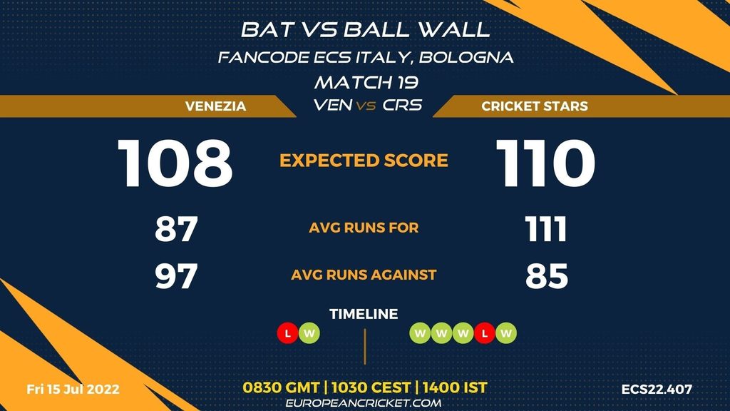 MATCH 19 (ECS22.403) VENEZIA (VEN) v CRICKET STARS (CRS) 0830 GMT | 1030 CEST | 1400 IST