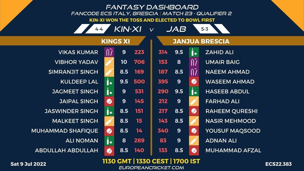 QUALIFIER 2 - MATCH 23 (ECS22.383) KINGS XI (KIN-XI) v JANJUA BRESCIA (JAB) 1130 GMT | 1330 CEST | 1700 IST