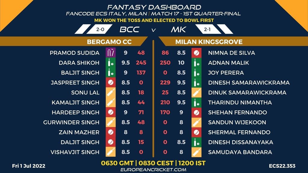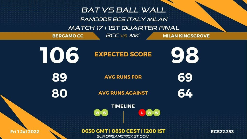 1ST QUARTER FINAL - MATCH 17 (ECS22.353) BERGAMO CC (BCC) v MILAN KINGSGROVE (MK) 0630 GMT | 0830 CEST | 1200 IST