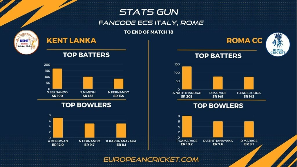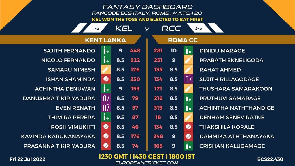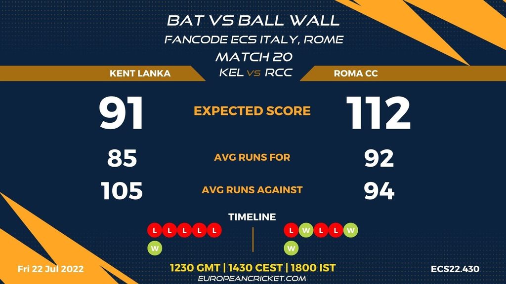MATCH 20 (ECS22.430) KENT LANKA (KEL) v ROMA CC (RCC) 1230 GMT | 1430 CEST | 1800 IST