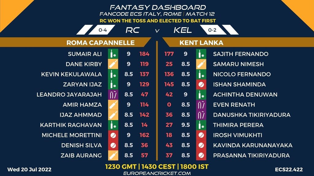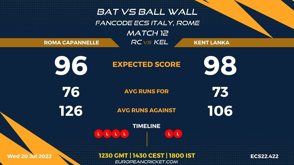 MATCH 12 (ECS22.422) ROMA CAPANNELLE (RC) v KENT LANKA (KEL) 1230 GMT | 1430 CEST | 1800 IST