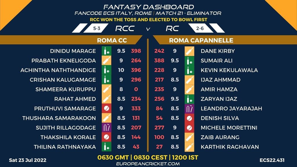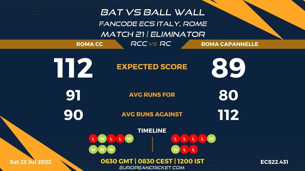 ELIMINATOR - MATCH 21 (ECS22.431) ROMA CC (RCC) v ROMA CAPANNELLE (RC) 0630 GMT | 0830 CEST | 1200 IST