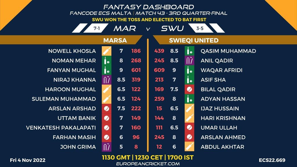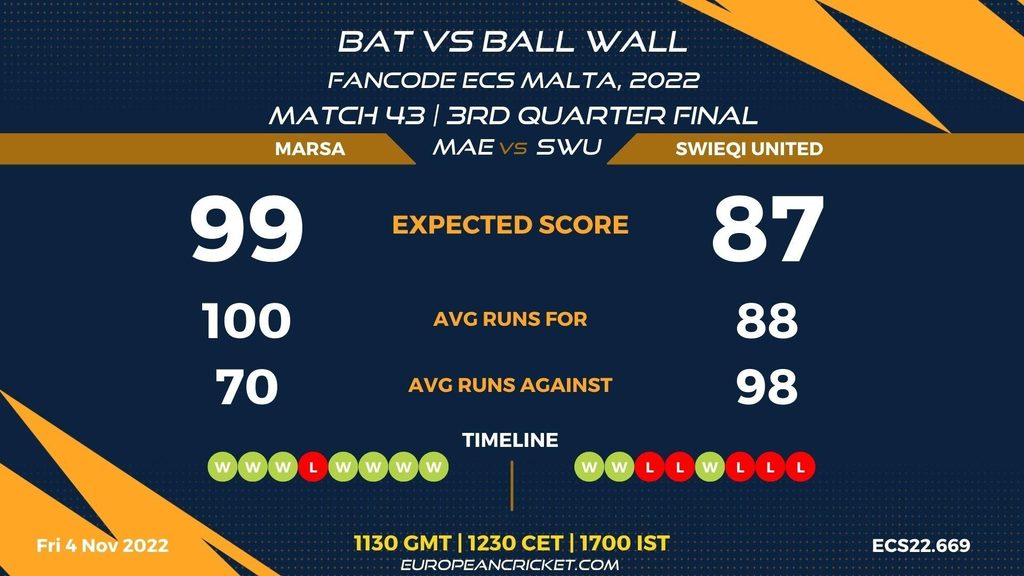 3RD QUARTER FINAL - MATCH 43 (ECS22.669) MARSA (MAR) v SWIEQI UNITED (SWU) 1130 GMT | 1230 CEST | 1700 IST