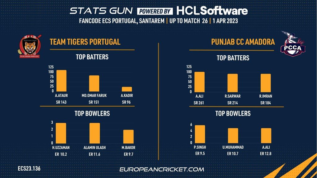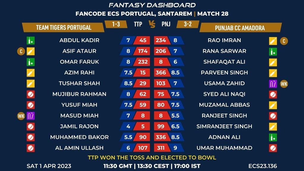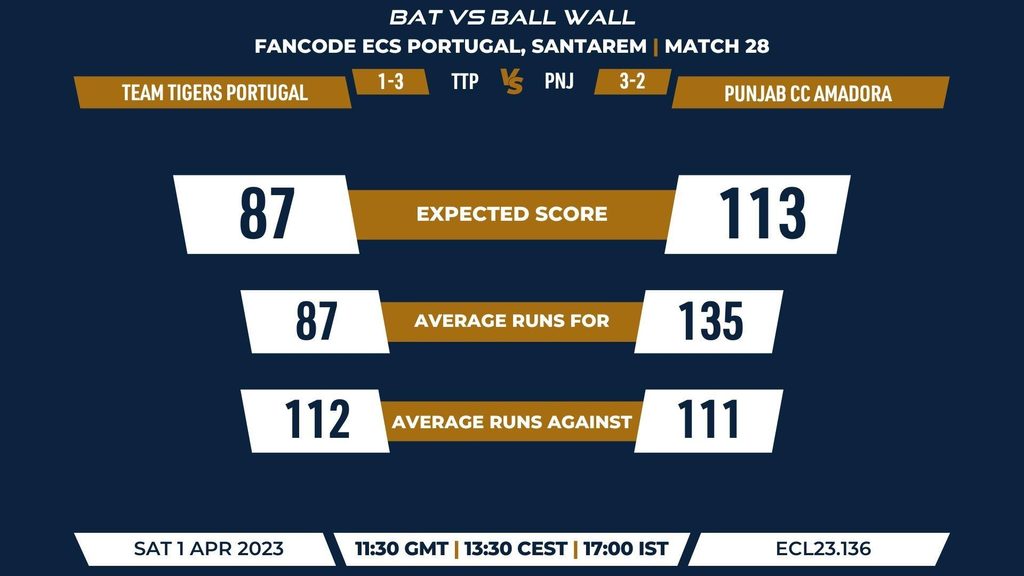 MATCH 28 (ECL23.136) TEAM TIGERS PORTUGAL (TTP) vs PUNJAB CC AMADORA (PNJ) 1130 GMT | 1330 CEST | 1700 IST
