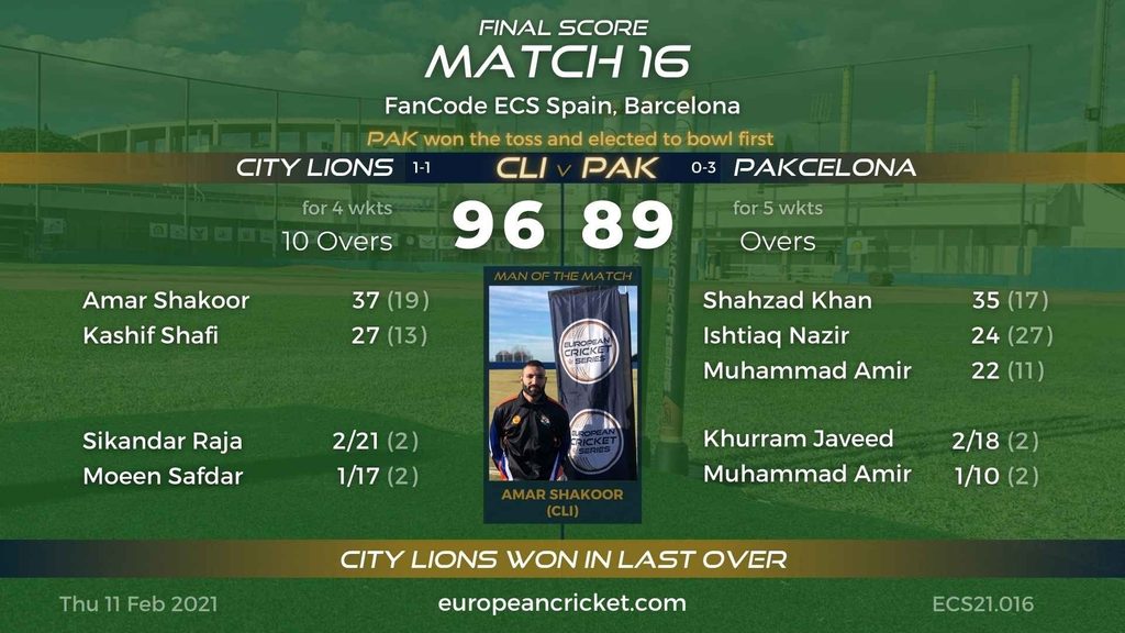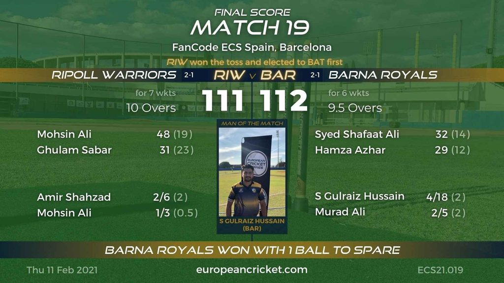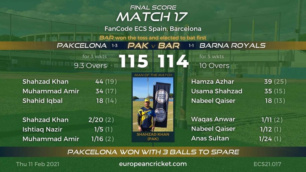 After a loss to City Lions, Pakcelona picked up their first win in another last-over thriller against Barna Royals, who then surprised previously unbeaten Ripoll Warriors.