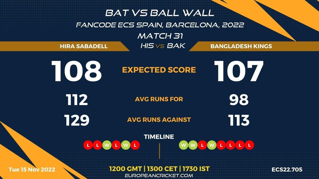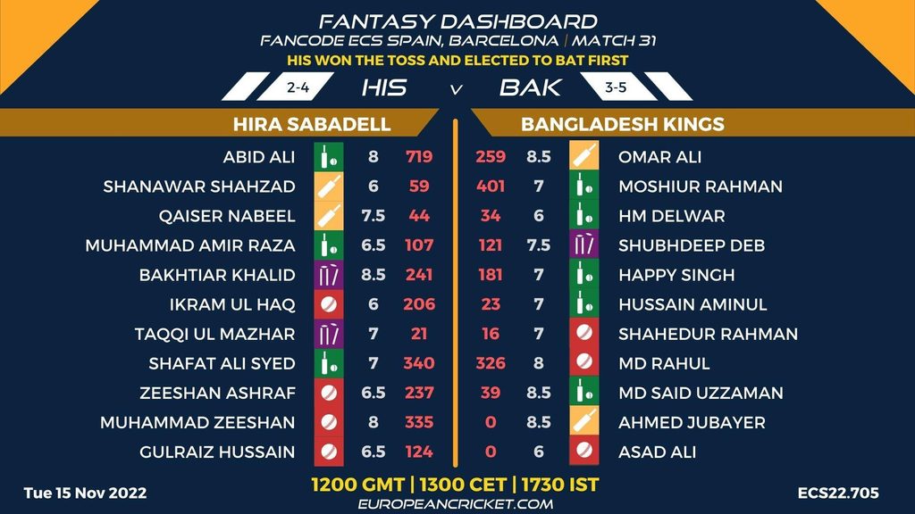 MATCH 31 (ECS22.705) HIRA SABADELL (HIS) v BANGLADESH KINGS (BAK) 1200 GMT | 1300 CEST | 1730 IST