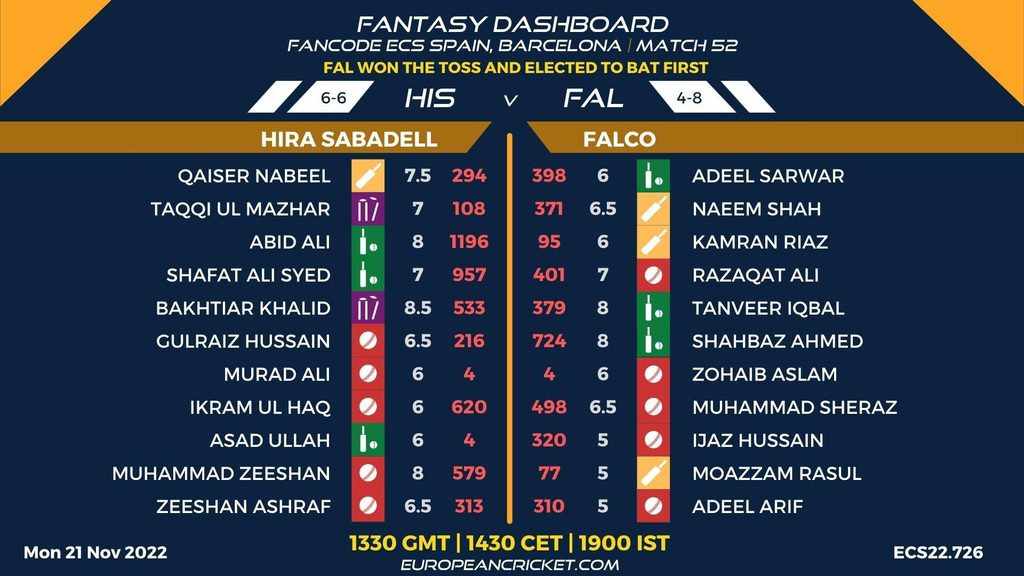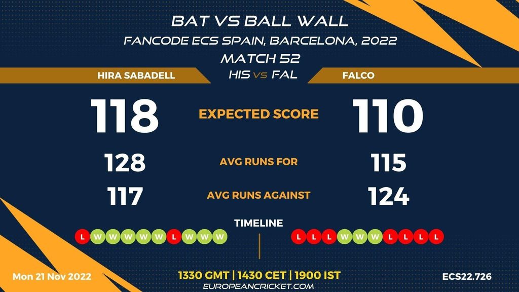 MATCH 52 (ECS22.726) HIRA SABADELL (HIS) v FALCO (FAL) 1330 GMT | 1430 CEST | 1900 IST