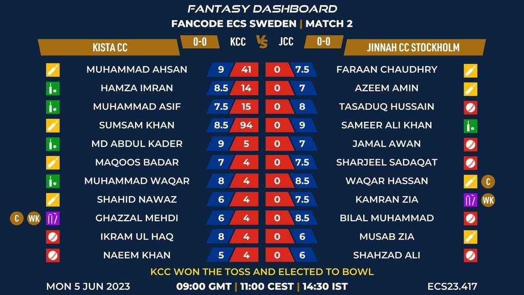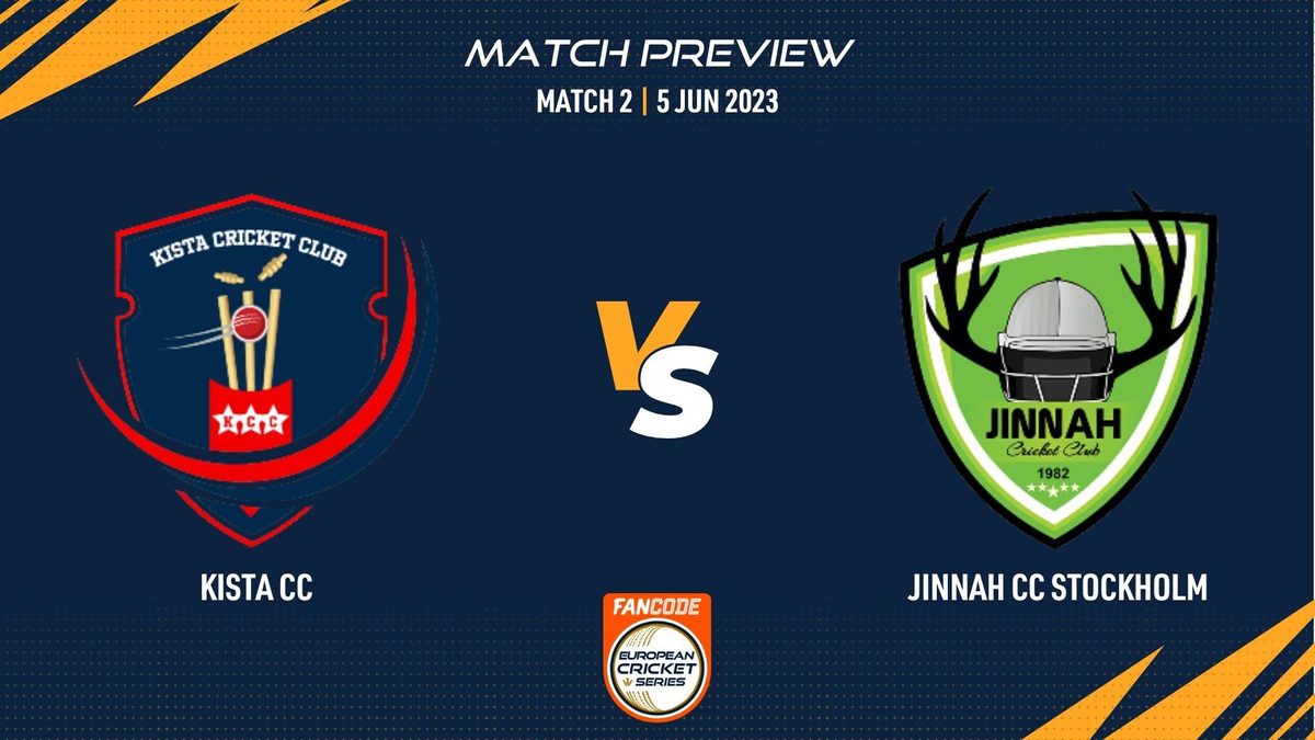 MATCH 2 (ECS23.417) KISTA CC (KCC) vs JINNAH CC STOCKHOLM (JCC) 09:00 GMT | 11:00 CEST | 14:30 IST