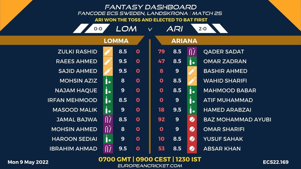 MATCH 25 (ECS22.169) LOMMA (LOM) v ARIANA CC (ARI) 0700 GMT | 0900 CEST | 1230 IST