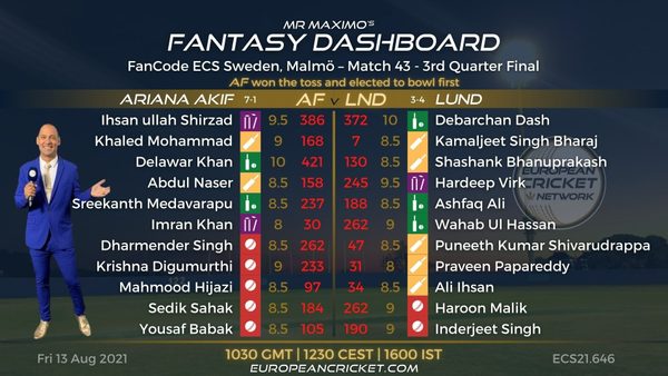 FANTASY Dashboard - 3rd Quarter Final - Match 43 - FanCode ECS Sweden Malmo Share Share Share on Facebook Share on Twitter Share on WhatsApp Copy Link Close