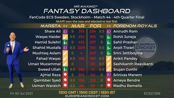 FANTASY Dashboard - 4th Quarter Final - Match 44 - FanCode ECS Sweden Stockholm Share Share Share on Facebook Share on Twitter Share on WhatsApp Copy Link Close