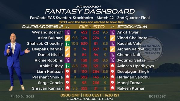 FANTASY Dashboard - 2nd Quarter Final - Match 42 - FanCode ECS Sweden Stockholm Share Share Share on Facebook Share on Twitter Share on WhatsApp Copy Link Close