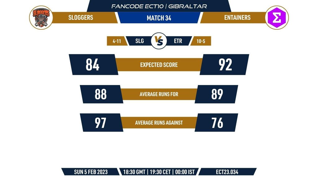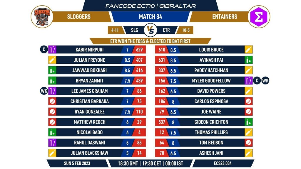 MATCH 34 (ECT23.034) SLOGGERS (SLG) v ENTAINERS (ETR) 1830 GMT | 1930 CEST | 0000 IST